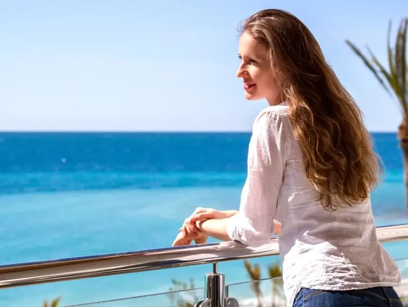 The beautiful girl standing on a balcony of apartments looking at the seaside.